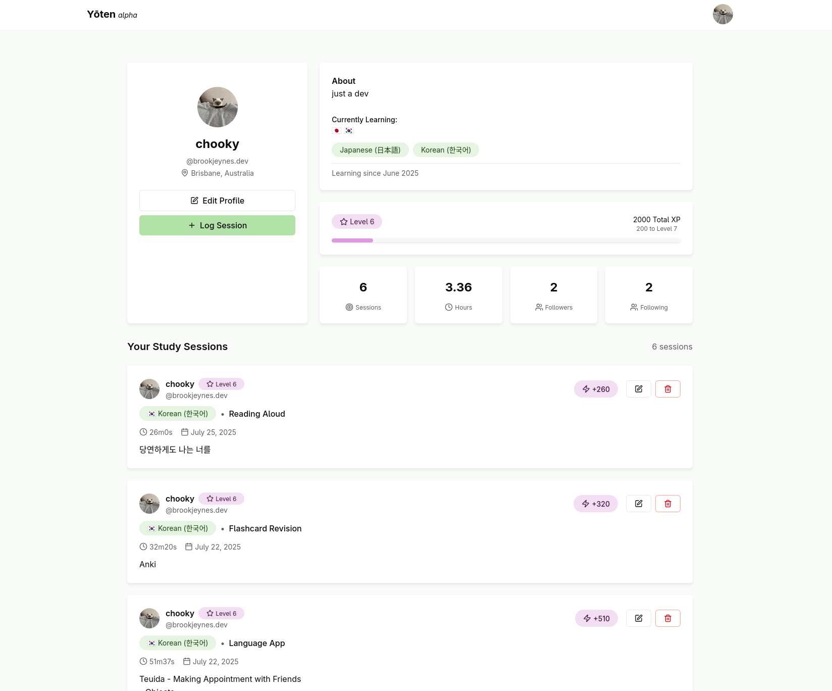 Yōten is a social tracker for your language learning journey. It's built around the idea that learning should be a shared experience. Track your study sessions, follow friends, see what the community is learning and stay motivated through self leveling.